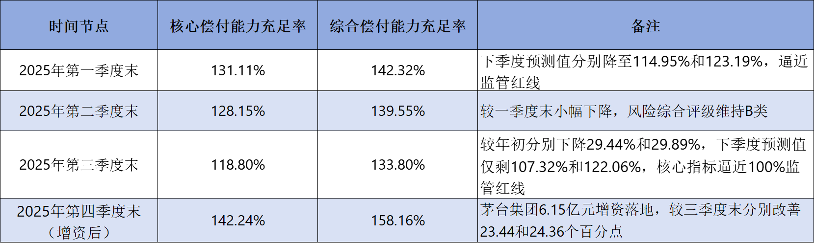 叠加《保险公司偿付能力监管规则(Ⅱ)》过渡期将于2025年底正式结束,监管对保险公司偿付能力的要求进一步收紧,资本压力从"宽松"走向"硬约束"。以及2025年年初启动的25至45亿元大规模募资计划屡屡延期,危急时刻,茅台集团四季度的增资缓解了华贵人寿的燃眉之急。
